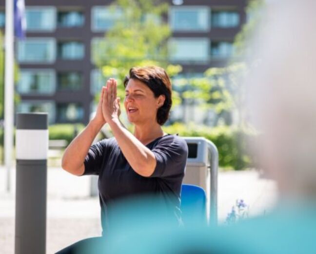 Yogadocente Heleen Weeland organiseert op locatie Moerzicht (Yerseke) een yogales op de stoel. De gemeente Reimerswaal biedt deze middag een gezonde smoothie aan.