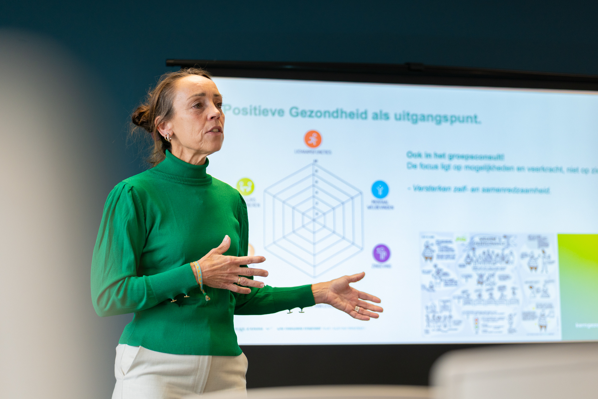 Het werken vanuit Positieve Gezondheid zorgt volgens Mireille voor meer samenhang tussen zorg, preventie en welzijn. Voor haar persoonlijk geeft het richting en verdieping in haar verschillende rollen. Voor organisaties leidt het tot betere samenwerking, meer werkplezier en een gedeelde visie. Ook intern wordt Positieve Gezondheid gebruikt, bijvoorbeeld voor team overleggen en reflectiemomenten. Dit helpt om het gesprek te voeren over balans, werkdruk en duurzame inzetbaarheid.